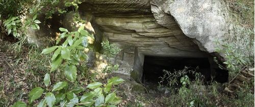 《鎌倉八百ヶ谷戸》Web写真集(PCの大画面で見てほしい) 急斜面に突然現れる石切り場の跡。 鎌倉石は堆積岩だから、地層に沿って切り出せば、平行な掘削面が残ると思うのだが、意外にも切り込みの方向が不規則な場合もある。 この石切り場は比較的綺麗な方…