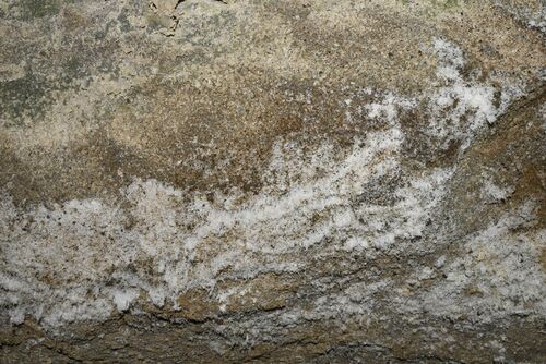 《鎌倉八百ヶ谷戸》Web写真集(PCの大画面で見てほしい) しっとりと湿っているため、鎌倉石の表面には苔が生じている。 白っぽいのはマグネシウムを含む岩石の分解物。 この石切り場は、切り出した方向がさまざま。 それが、何がしかのパズルのようで、文様…