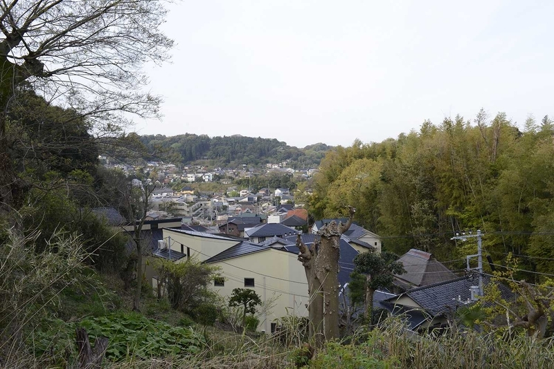 円覚寺の北、横須賀線の東側は六国見山の山裾で、線路に沿って切岸が続いている。あたかも線路を通すために掘削したかのように感じられるが、古い地図を見ると、それ以前から垂直に構造された切岸の崖面があったようだ。この辺りは鎌倉に入るための主要路である。現在、切岸は家の背後に隠れて見え難いが、写真の八幡神社の階段の脇では垂直に掘削されているのがよく判る。それが北鎌倉駅近くまでずっと続いている。